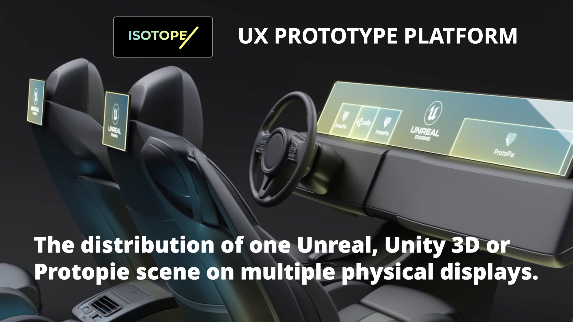 Isotope, combines leading automotive prototyping tools such as ProtoPie, Unity and Unreal to create a seamless user experience in multiple locations and on multiple displays at the same time. Isotope speeds up processes ensuring that a full prototype functionality can be tested at an early stage, and instantly validates the user experience