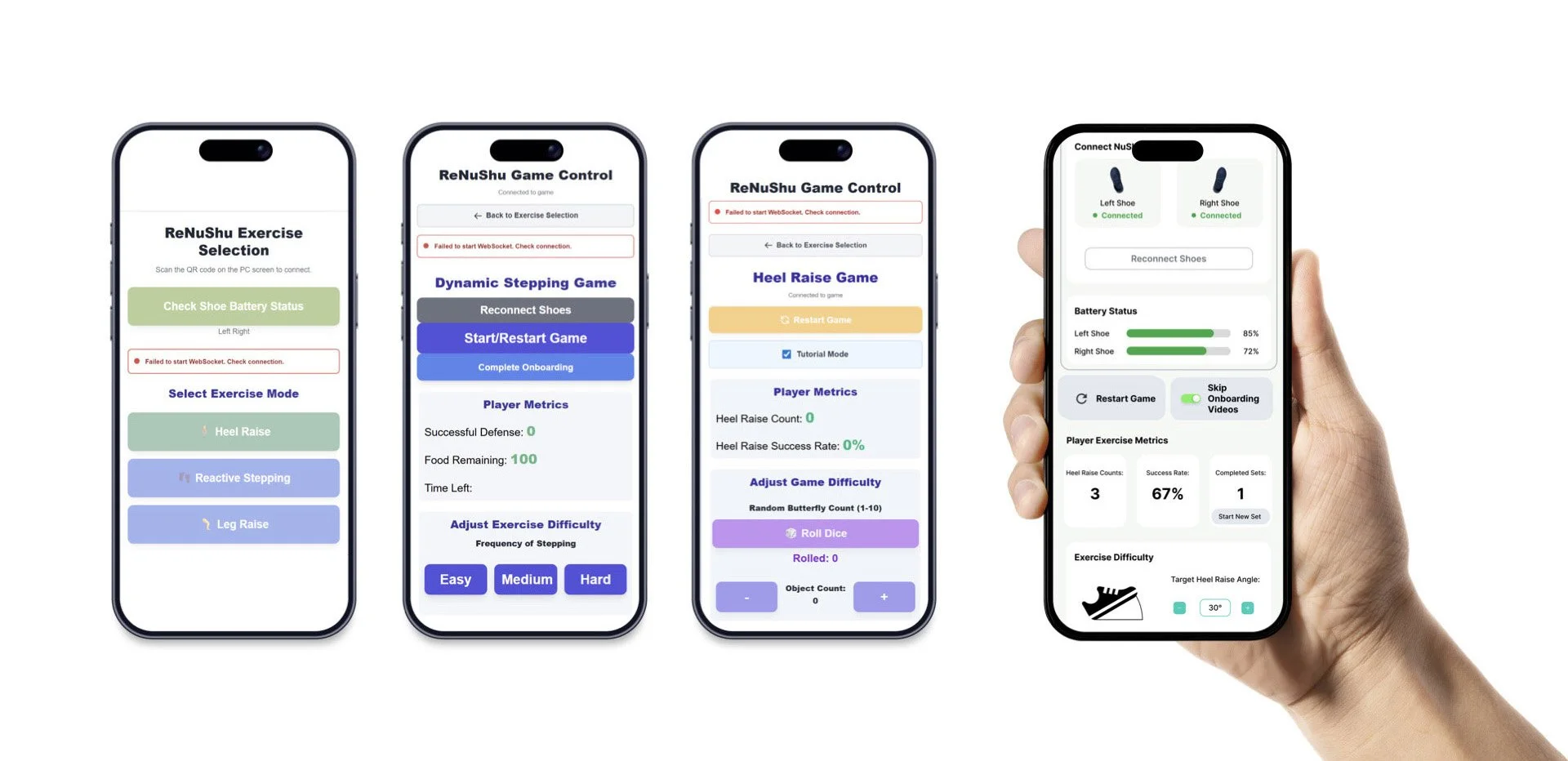 NuShu smart shoes provide real-time gait estimation and gentle haptic cues. Students designed a system that turns those signals into adjustable challenges aligned with clinical goals. Clinicians set targets, tune difficulty in seconds, and review clear session summaries. We combine game design, engineering, art, and user research to translate rehab goals into play.
